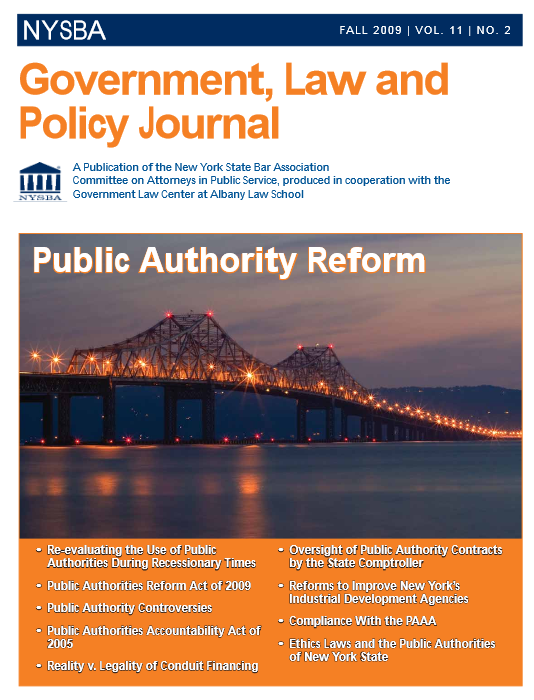 The Fall, 2009 issue of the NYSBA Government Law and Policy Journal was devoted to the topic of public authority reform, and was guest edited by Public Authorities Project director Scott Fein.